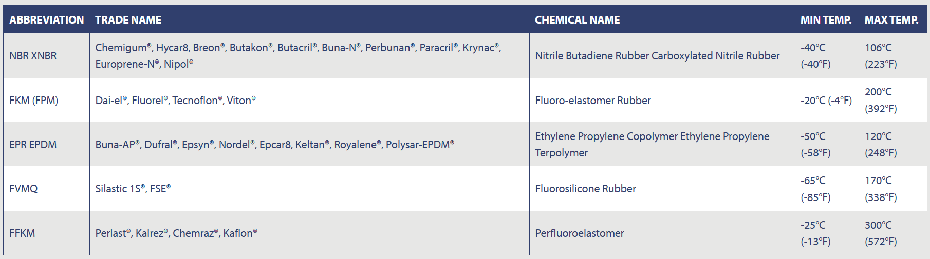 Available Seals and Temperature Range